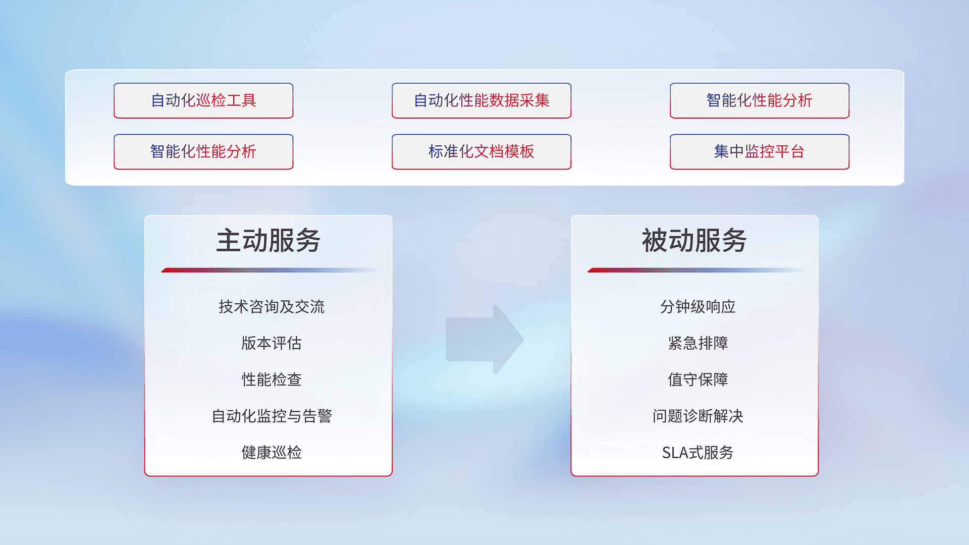 智能化工具和标准化文档,,,,保障服务质量,,,,提供主动服务(包含技术咨询、、、、版本评估、、、性能检查、、、自动化监控与告警、、健康巡检)和被动服务包含(分钟级响应、、、紧急排障、、、值守保障、、问题诊断解决、、SLA服务)。。。
